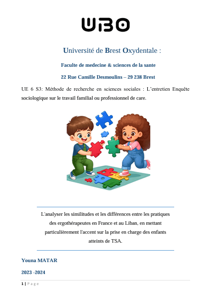 Ce projet a porté sur une enquête comparative entre les pratiques professionnelles des ergothérapeutes en France et au Liban, centrée sur la prise en charge des patients atteints de troubles du spectre de l’autisme (TSA). L’objectif était d’identifier les similitudes et différences dans l’approche, l’éthique de soin, les ressources disponibles, et la manière dont les contextes culturels influencent la pratique professionnelle.