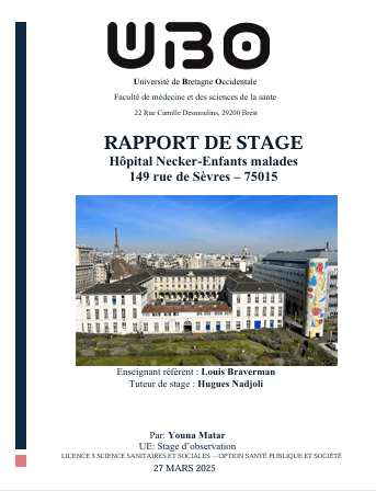 Dans le cadre de ma troisième année de licence, j’ai effectué un stage d'observation au sein du service de cardiologie pédiatrique de l’hôpital Necker – Enfants Malades, à Paris. Ce stage m’a permis de m’initier aux méthodes de recueil et d’analyse de données en épidémiologie, en participant à la création et au remplissage d’une base de données concernant des patients traités par un nouvel anticoagulant. J’ai également contribué à la gestion des événements indésirables dans le cadre de la pharmacovigilance, à travers la collecte d’informations cliniques, l’analyse statistique des risques, et la rédaction d’un rapport. Cette expérience m’a permis de renforcer mes compétences en traitement de données de santé, en rigueur scientifique et en collaboration interprofessionnelle, dans un environnement hospitalier exigeant.